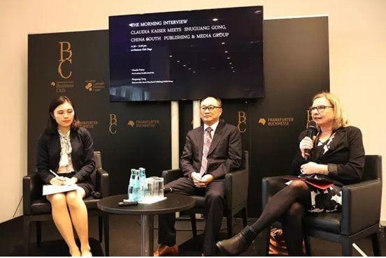 中南出版?zhèn)髅郊瘓F董事長龔曙光先生(中)對話法蘭克福書展副總裁柯樂迪女士(右)。